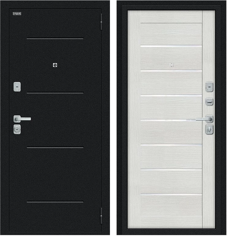 Надежная входная Дверь Браво Техно/BChrome Букле черное/Bianco Melinga премиум класса по цене 32 883 руб. Большая толщина стали защитит от проникновения в ваш дом, квартиру или коттедж. Используется очень качественная фурнитура: замки, цилиндры, ручки, защелки. Покрытие и отделка двери изготовлено под внимательным контролем производителя. Дверь имеет долгий срок службы и гарантию.